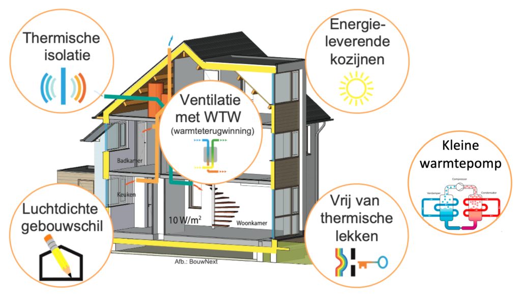 Voor nieuwbouw kan het vermogen nog verder naar beneden te krijgen omdat je dan een volledig passiefhuis kan maken met een vermogen voor verwarmen van 10-12 W/m2 en een elektrisch vermogen van 400 W is dan al ruimschoots voldoende.